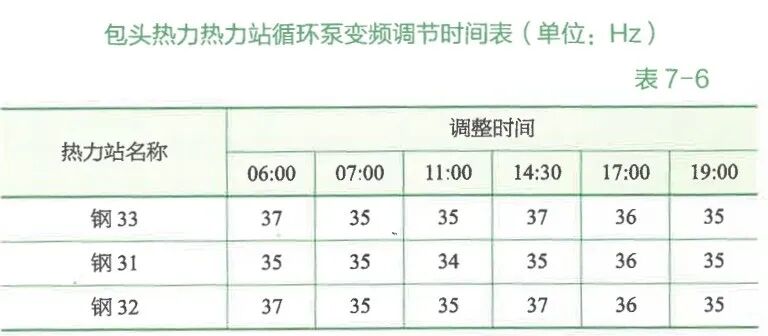 按照供熱負(fù)荷分布情況,結(jié)合站內(nèi)循環(huán)泵,將變頻調(diào)節(jié)劃分為幾個(gè)時(shí)段來(lái)進(jìn)行分別調(diào)控(表7-6),以實(shí)現(xiàn)更加精細(xì)化的節(jié)電管理。