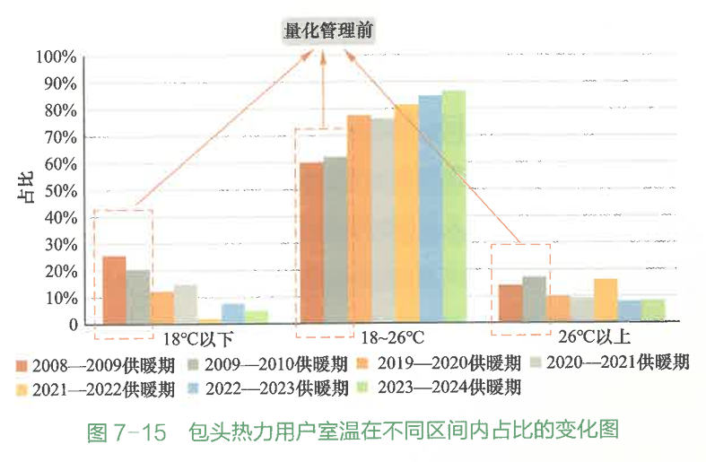 同時(shí),用戶室溫在18-26℃的比例由60.1%升至87%,節(jié)能降耗的同時(shí)達(dá)到了均衡供熱的效果(圖7-15)。
