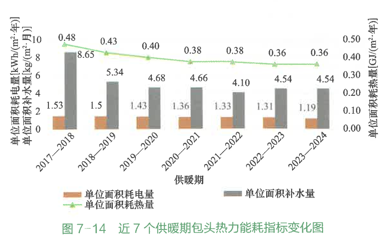 包頭熱力從2018-2019供暖期開(kāi)始執(zhí)行熱耗精細(xì)化管理工作,截至2023-2024供暖期,單位面積耗熱量從0.48GJ/(㎡·年)降至0.36GJ/(㎡·年),累計(jì)減少能源浪費(fèi)2520萬(wàn)GJ,折合標(biāo)準(zhǔn)煤86萬(wàn)t,累計(jì)減少碳排放214萬(wàn)t;單位面積耗電量從1.53kWh/(㎡·年)降至1.19kWh/(㎡·年),累計(jì)節(jié)約用電7140萬(wàn)kWh;單位面積補(bǔ)水量從8.65 kg/(㎡·月)降至4.54 kg/(㎡·月),累計(jì)節(jié)約用水518萬(wàn)m3(圖7-14)。