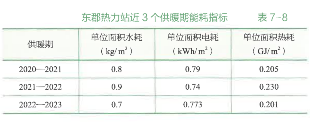 為了有效節(jié)能降耗,運(yùn)城熱力在每年的供熱準(zhǔn)備階段制定水耗、電耗、熱耗考核指標(biāo),考核到站,考核到人。在供熱運(yùn)行階段,調(diào)度中心對(duì)熱力站運(yùn)行參數(shù)進(jìn)行實(shí)時(shí)監(jiān)控,發(fā)現(xiàn)異常立即通知熱力站站長(zhǎng)到站查看處理,每日對(duì)所有熱力站水耗、電耗、熱消耗指標(biāo)進(jìn)行排名、通報(bào);熱力站站長(zhǎng)每日根據(jù)調(diào)度中心通報(bào),結(jié)合熱力站運(yùn)行參數(shù)、二次側(cè)管網(wǎng)情況和用戶(hù)實(shí)際供暖效果對(duì)各項(xiàng)指標(biāo)進(jìn)行分析,發(fā)現(xiàn)異常及時(shí)調(diào)整運(yùn)行參數(shù)、查找漏水點(diǎn);運(yùn)行分公司每月對(duì)各熱力站指標(biāo)進(jìn)行統(tǒng)計(jì)分析,橫向?qū)Ρ韧?lèi)型熱力站,縱向?qū)Ρ壬弦还┡谕谙?,?duì)異常指標(biāo)進(jìn)行分析,并采取相應(yīng)措施。東郡熱力站近3個(gè)供暖期能耗指標(biāo)見(jiàn)表7-8。