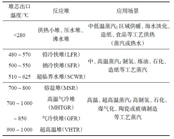 核能可為各類工業(yè)提供熱源,包括化工、造紙、煉油和制氫等工業(yè)。核能供熱具備顯著的多樣性特點(diǎn),可以根據(jù)用戶側(cè)的不同需求,采用不同類型的反應(yīng)堆匹配不同的需求。核能所提供的熱源溫度范圍廣,可以涵蓋150~1000℃;如目前已大規(guī)模商業(yè)化運(yùn)行的壓水堆可提供的最高蒸汽溫度約250℃,第四代金屬冷卻反應(yīng)堆可提供的最高蒸汽溫度約500℃,第四代高溫氣冷堆可輸出最高蒸汽溫度在700~1000℃。因此,核能可滿足從低溫(500℃)和超高溫(>540℃)各類型的供熱需求,詳見下表:
