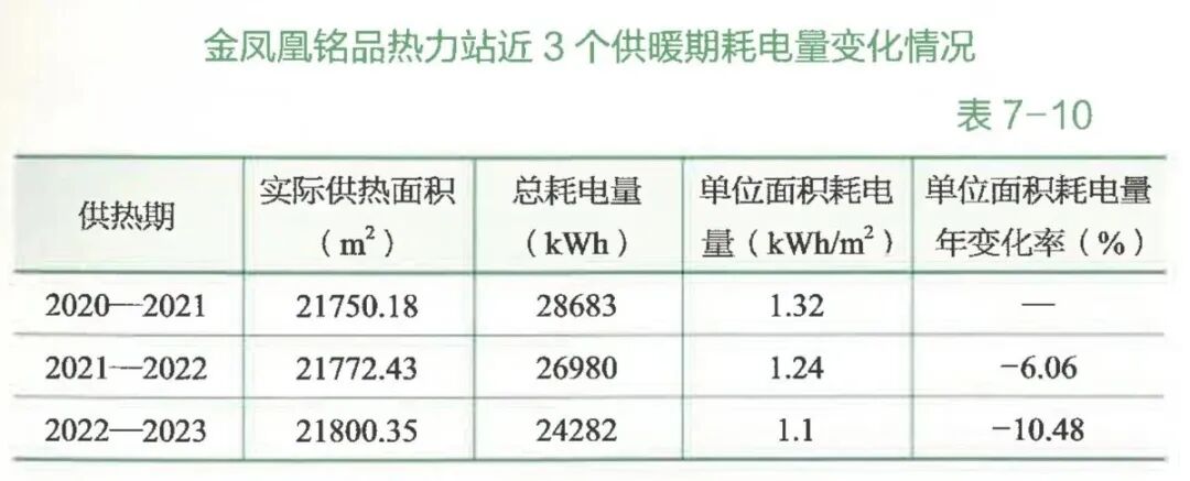 通過實行上述管控措施,金鳳凰銘品熱力站2021-2022供暖期單位面積耗電量為1.24KWh/㎡,較2020-2021供暖期降低6.06%;2022-2023供暖期單位面積耗電量為1.1KWh/㎡,較2021-2022供暖期降低10.48%;耗電量呈現(xiàn)明顯下降趨勢(表7-10)。